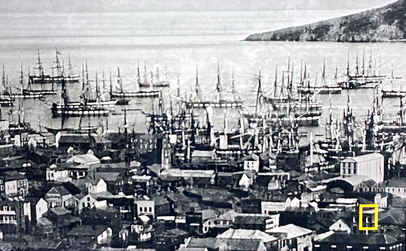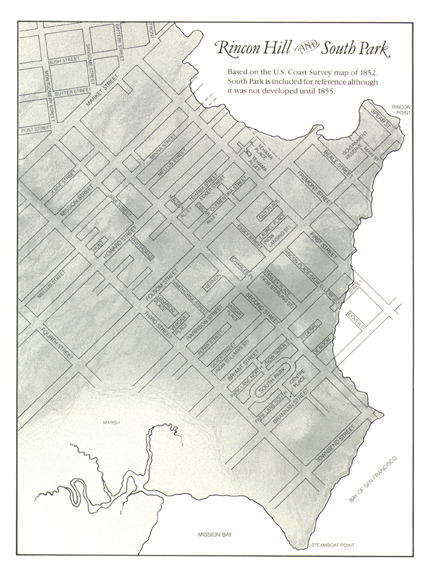 At one time Rincon Point was located where Rincon Hill met the bay (left) at what is now the intersection of Spear and Harrison streets (right). Now it is a block east where the Embarcadero passes underneath the Bay Bridge. Rincon Point and Telegraph Hill formed the original inlet that provided 49ers with additional protection for their ships. This inlet, upon which many downtown highrises have been built, reached all the way west to where the Transamerica Pyramid is today. Click on the images to see a larger versions.